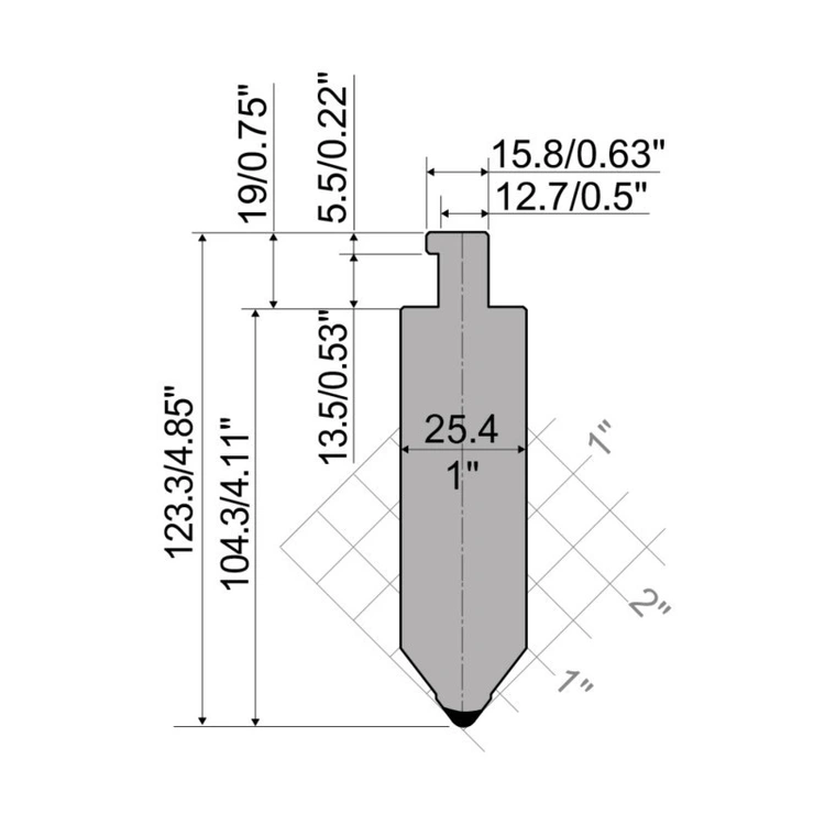 Punch R5 American type CLASSIC Series with Working height=104.3mm, α=75°, Radius=6.35mm, Material=42cr, Max. load=1000kN/m.