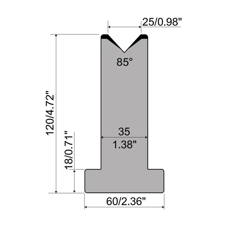 T die R1 European type with height=120mm, α=85°, Radius=3mm, Material=C45, Max. load=1000kN/m.