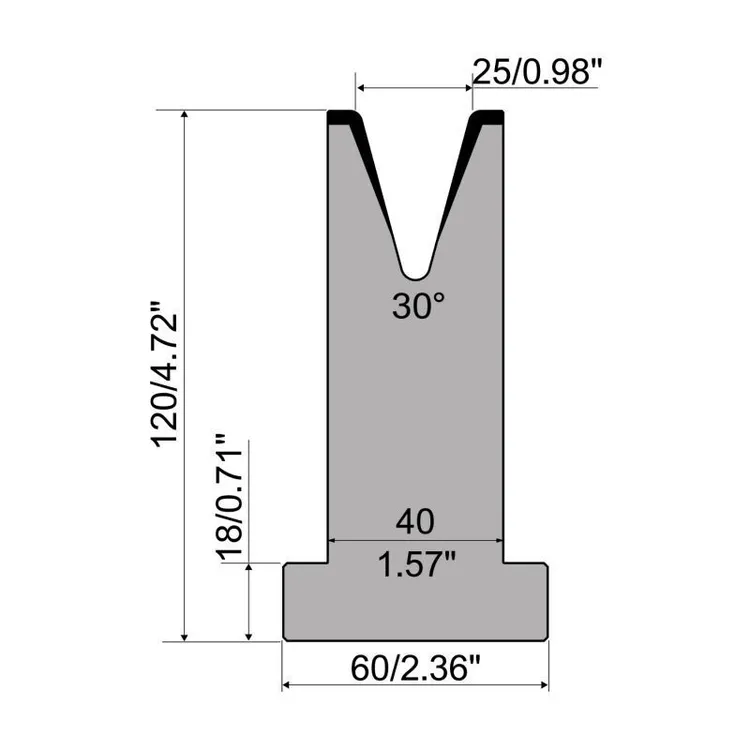 T die R1 European type with height=120mm, α=30°, Radius=3mm, Material=C45, Max. load=500kN/m.