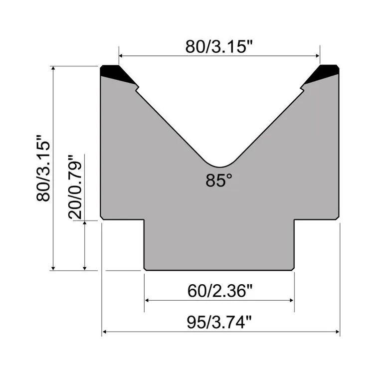 1-V die R1 European type with height=80mm, α=85°, Radius=6mm, Material=C45, Max. load=1000kN/m.